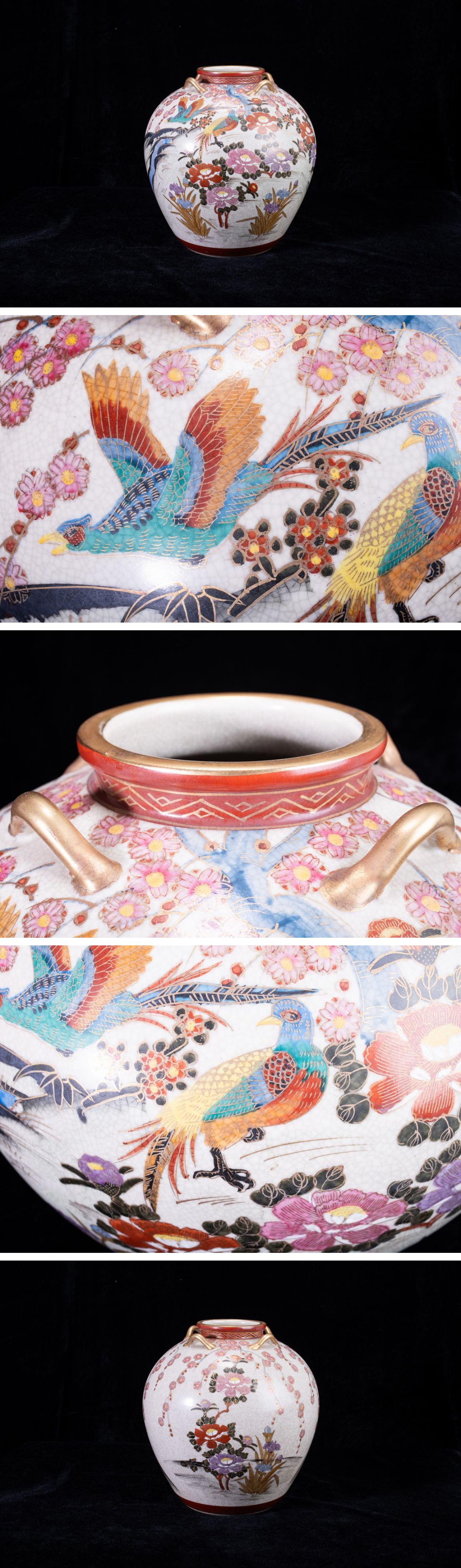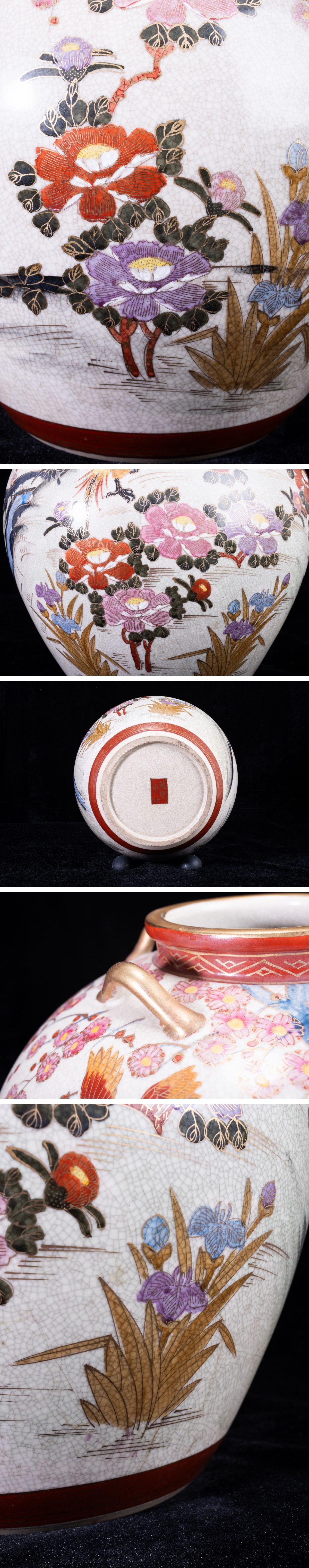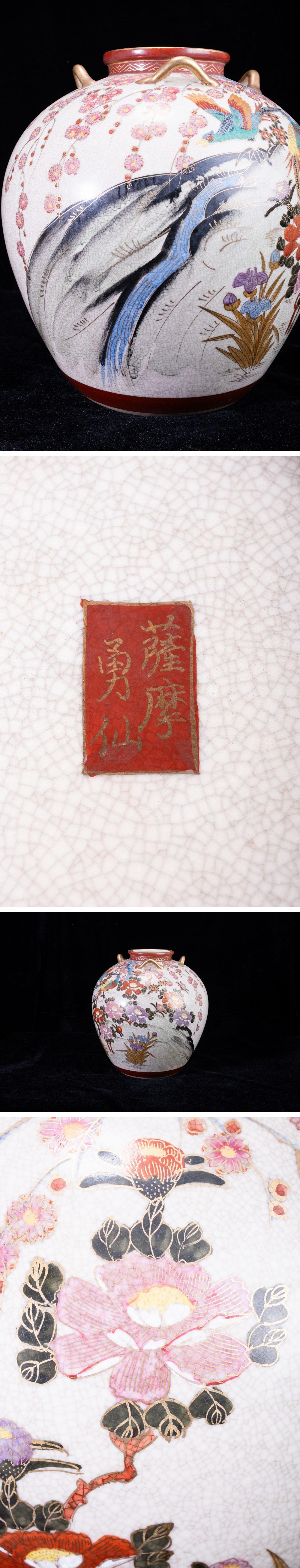 - 【珍品堂】1円から N20-V4 薩摩焼 勇仙 作 在銘 花絵 色絵 牡丹 雉鶏 金彩 細密細工 両耳 花瓶 高33㎝ 飾壺 工芸品 時代物 骨董品 古美術