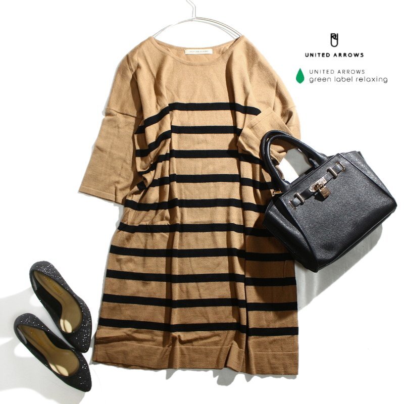 > 美品 ユナイテッドアローズ グリーンレーベルリラクシング UNITED ARROWS green label relaxing 毛50% ボーダーニットワンピース ベージュ
