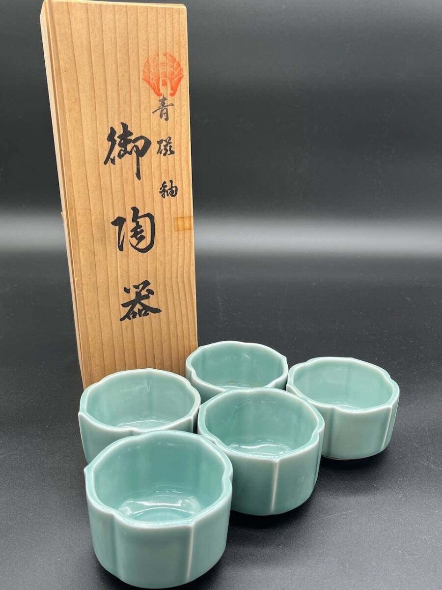 - 青磁釉 色鍋島 小鉢 5客 共箱 直径9.5×高6.5㎝ 325g 青磁 小皿 色鍋島窯 茶道具 懐石道具 懐石 茶道 食器 料理 陶器 青磁器製小鉢 (20332)