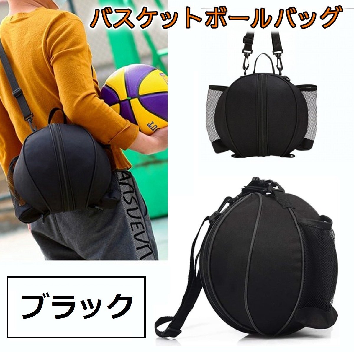 > 【VAPS_1】バスケットボールバッグ 《ブラック》 ショルダー付き ポケット2個付き 肩掛け 収納バッグ 持ち運び 保管 サッカーボール 送込
