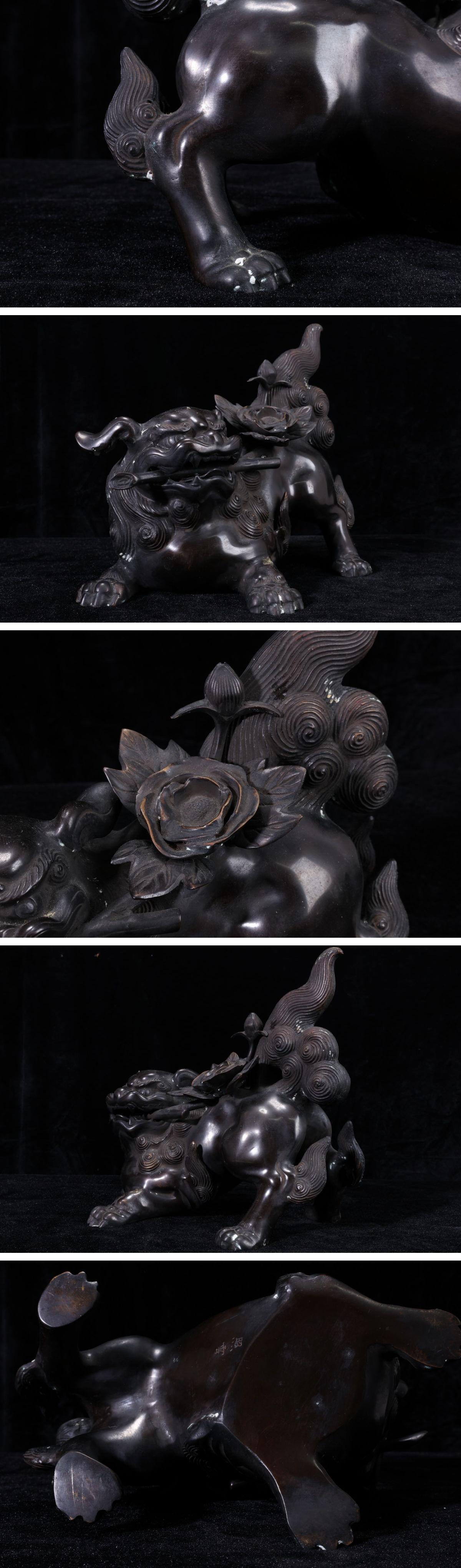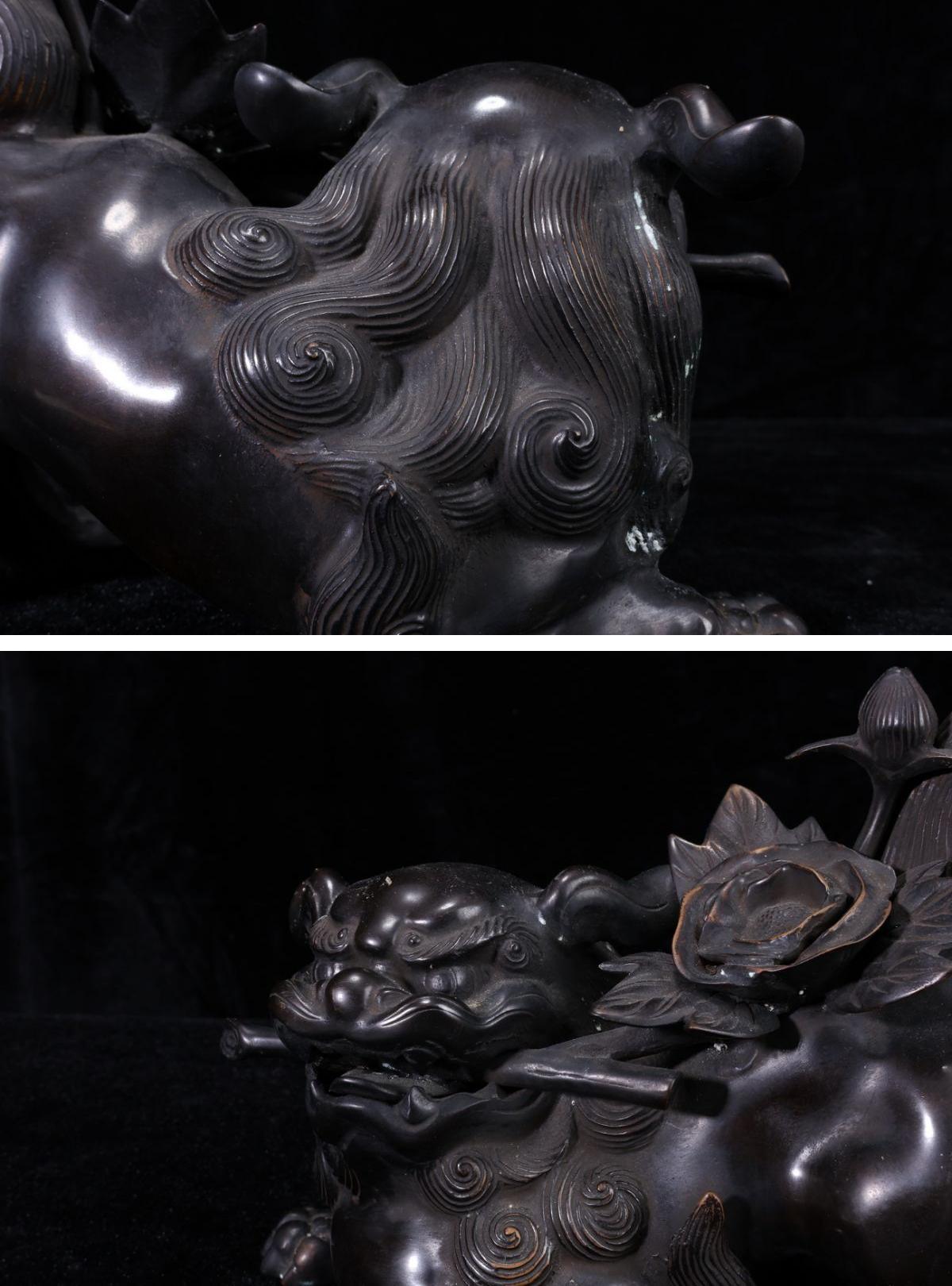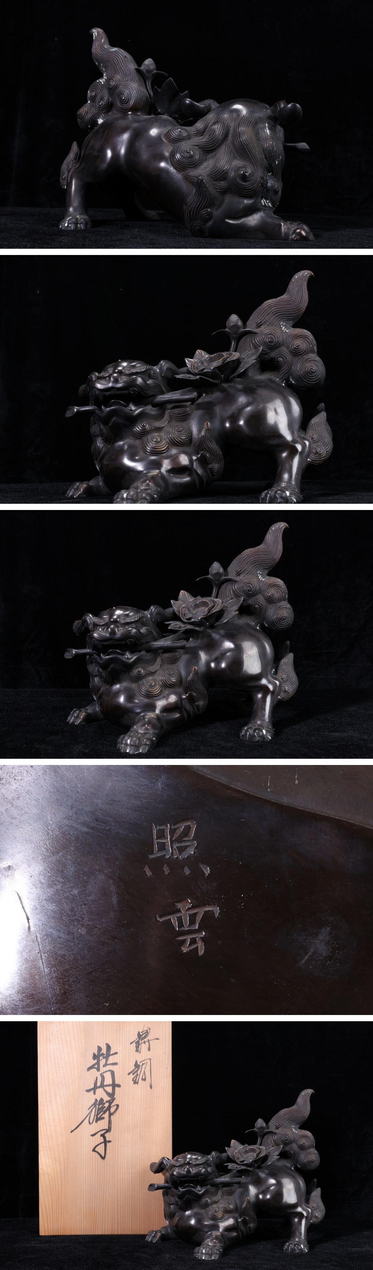 - 【珍品堂】1円から N79-N2 金工師 照雲 作 牡丹獅子 在銘 細密細工 銅製 高22㎝ 共箱 木箱 縁起物 ブロンズ 時代物 工芸品 骨董品 希少