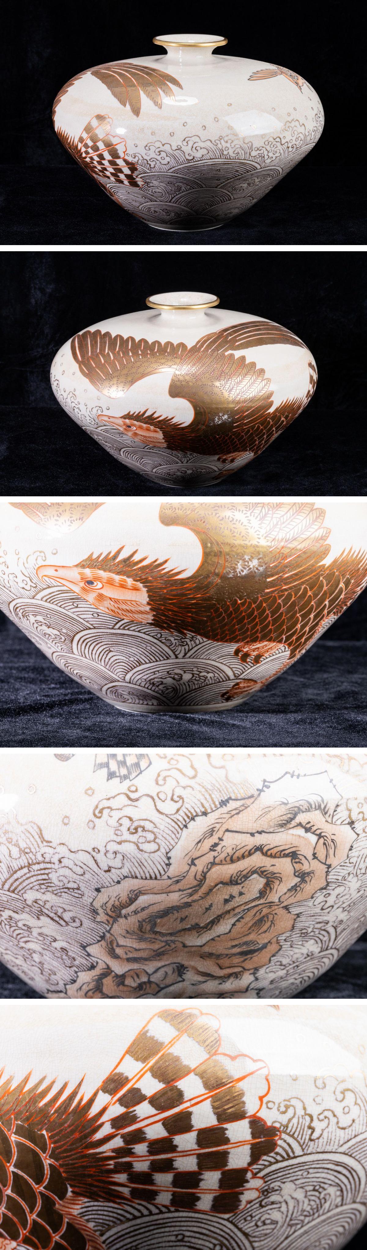 > 【珍品堂】1円から N71-V11 薩摩焼 金彩 染錦 鷹 鳥図 繊細絵付 花瓶 高27㎝ 飾壷 古薩摩 鑑賞品 時代物 工芸品 骨董品 古美術 美品