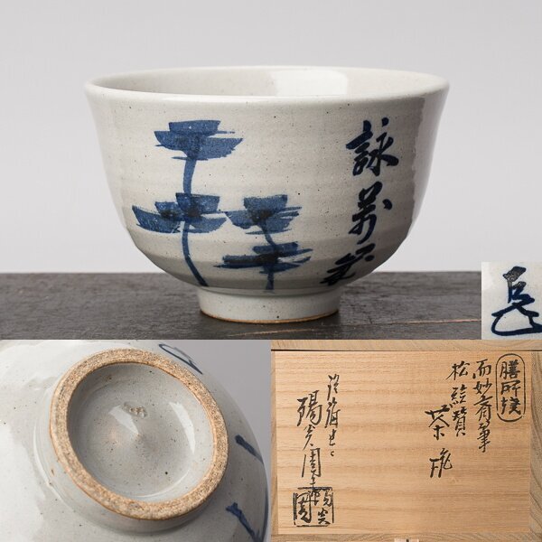 - 【千h0209】膳所 陽炎園 而妙斎 筆 松絵賛 茶碗 共箱 表千家 膳所焼 岩崎新定