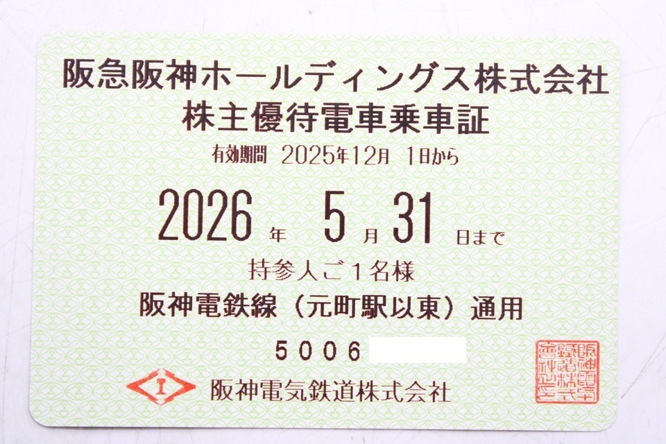 - 【当店直接引取り可能】阪急阪神HD 株主優待電車乗車証 定期券 2025年12/1~26年5/31 阪神電鉄線(元町駅以東)通用 ITOI5WON1RAY-Z00-byebye