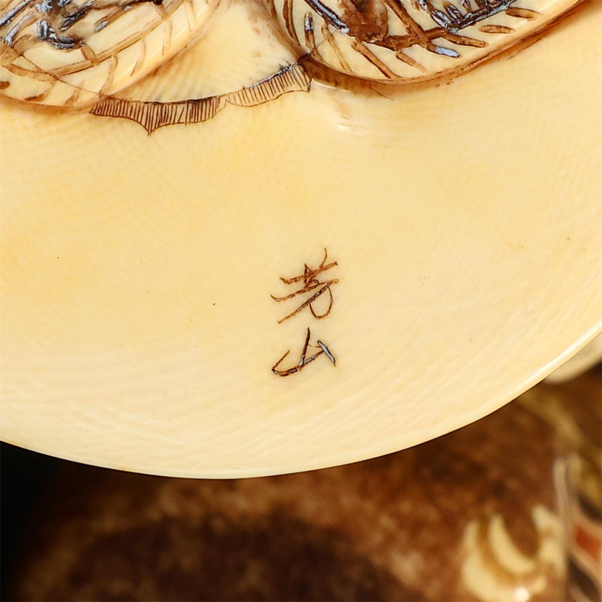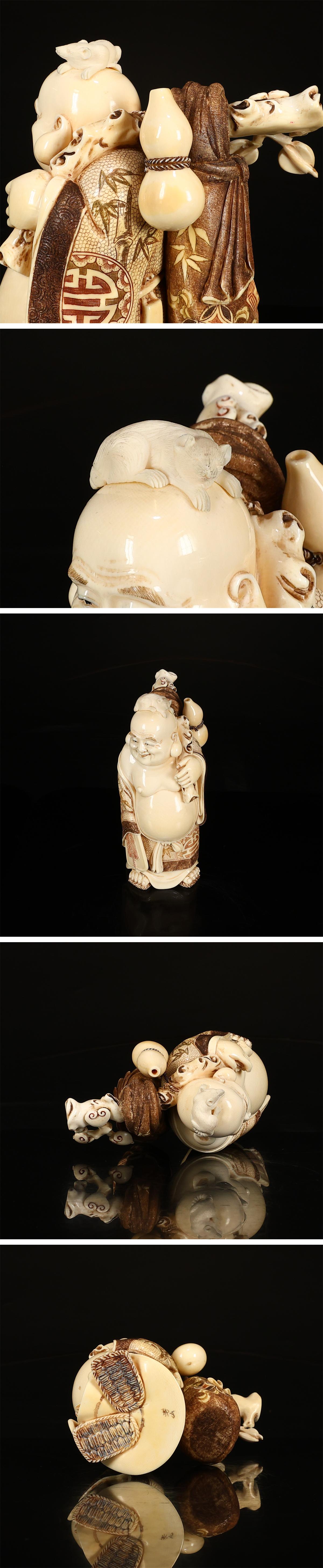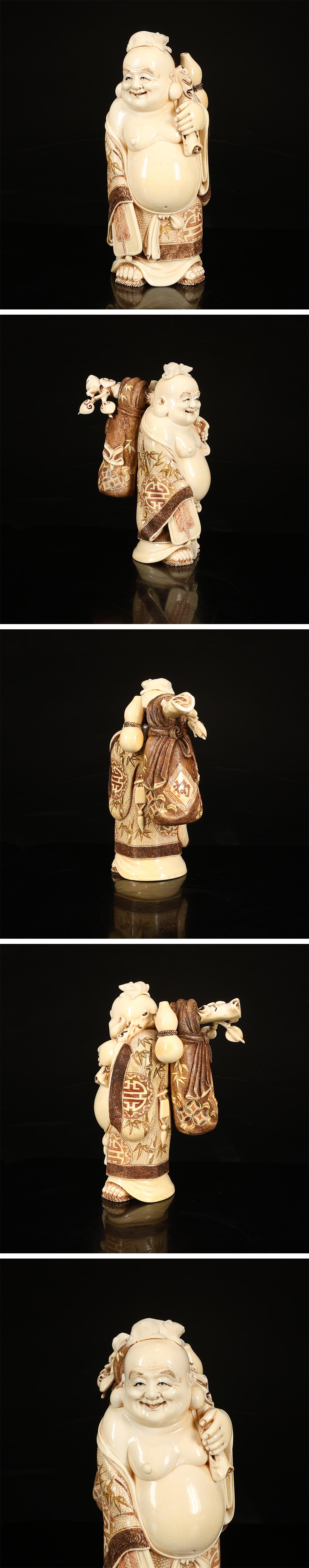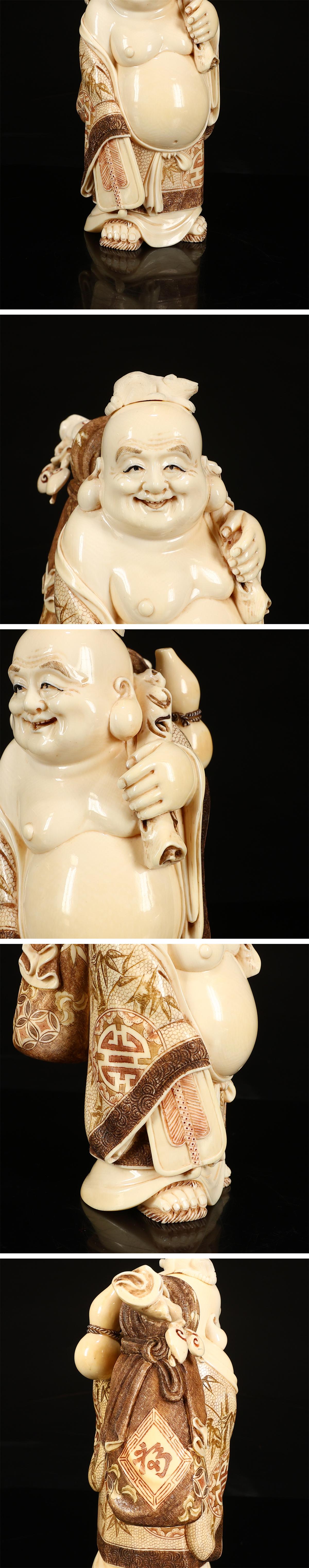 - 久1434 時代 【芳山 銘】 東洋彫刻 彩絵 布袋 置物 大型 高19㎝ 重1083g N!