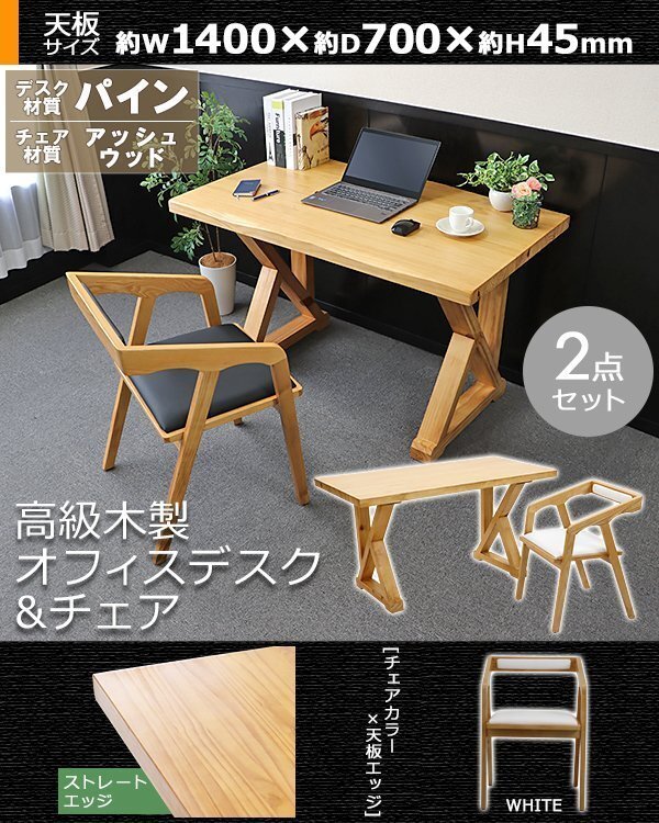 - 送料無料 オフィスデスク オフィスチェア 2点セット ストレートエッジ 白 約W1400×約D700×約H750mm オフィステーブル パイン材 アッシュ