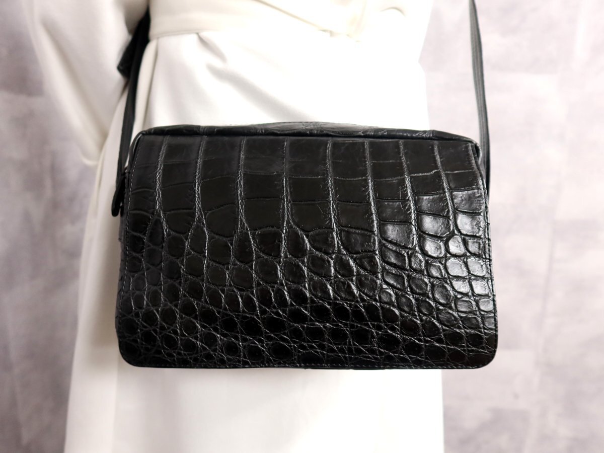 > ●超美品●Takechi タケチ●メンズ●マット クロコダイル 本 ワニ 革●ショルダー バッグ●黒●シルバー金具●斜め掛け●かばん●Js62438