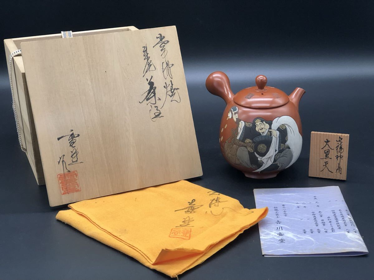 > 煎茶道具 常滑焼 吉川雪堂 壷堂刻 朱泥 急須 茶注 大振 彩色 七福神 大黒天 横手 茶器 茶道具 共箱