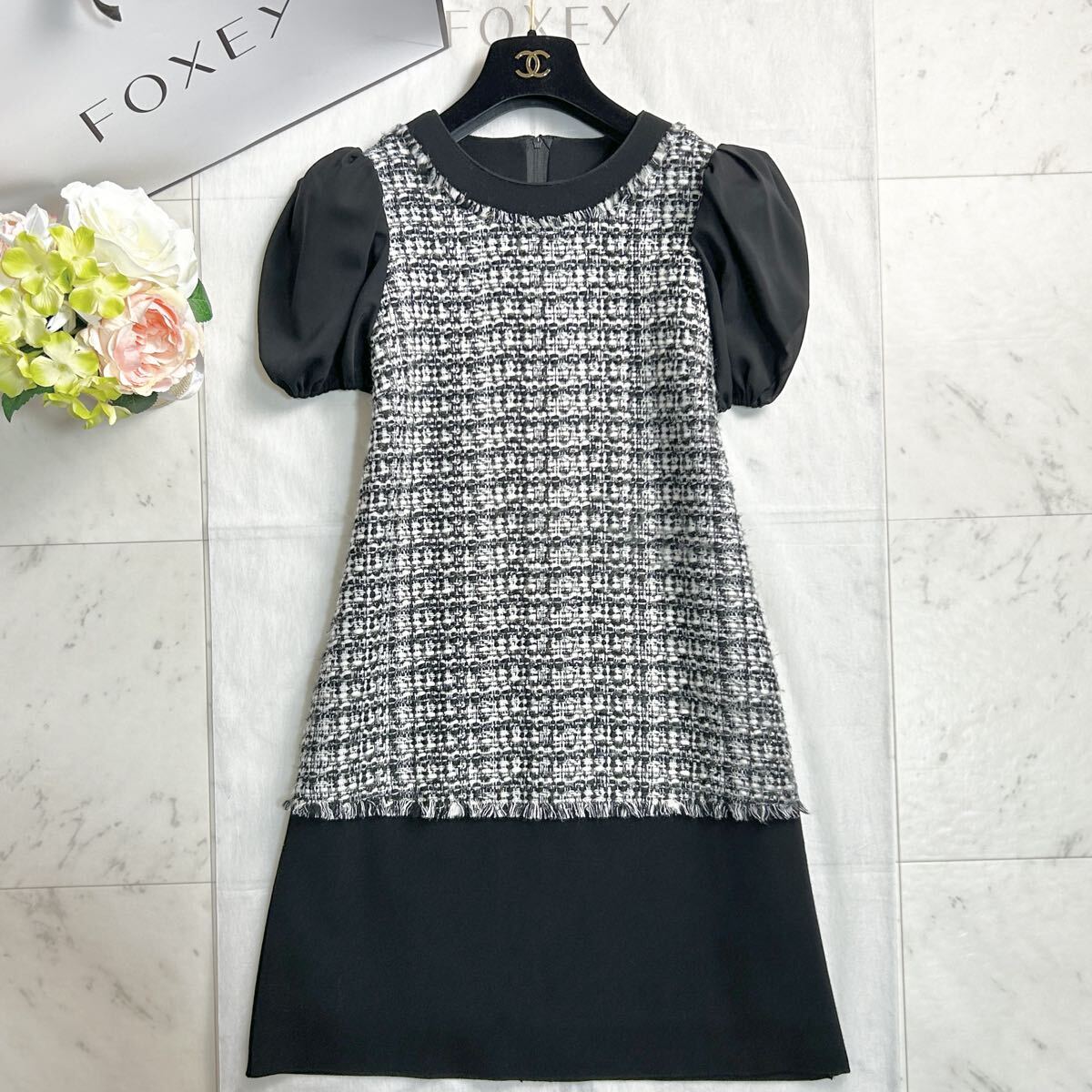 - 極美品★FOXEY フォクシー★40★春大活躍♪最高級ツイード ニットワンピース★ブラック×ホワイト BLENDツイード ドレス シフォン袖 完売品