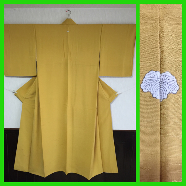 - 【色無地訪問着】正絹 袷 身丈154cm 松葉地紋 蔦家紋 梔子色