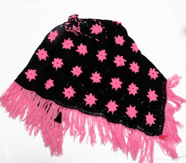 - USA70’ヴィンテイージ手編みヒッピーポンチョストール黒ピンク1