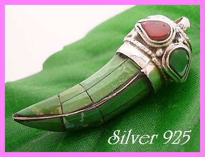- シルバー925銀の天然石ターコイズ&珊瑚mix 銀牙ペンダント小/銀細工ハンドメイド