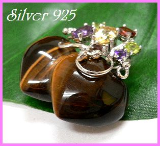 - シルバー925銀の天然石タイガーアイWハート&カラーストーン ジュエリー付ペンダント