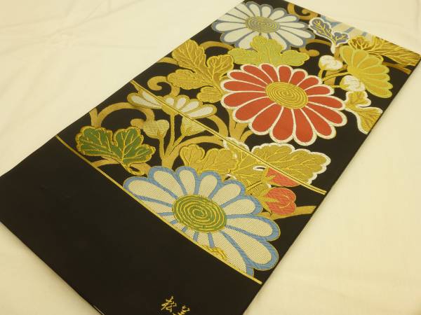 > 新品・未仕立て★京都西陣・ となみ織物製袋帯★黒地に菊柄です
