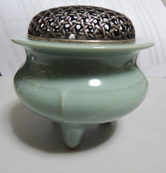 青磁香炉 東山銘 純銀蓋 銘有 共箱