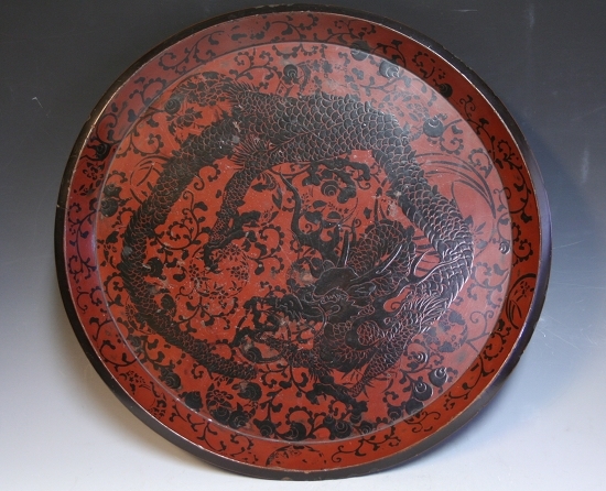 - *華**【即決】時代漆器/漆絵/朱漆塗龍文丸盆/江戸時代(古美術骨董伝統工芸漆器漆芸H507
