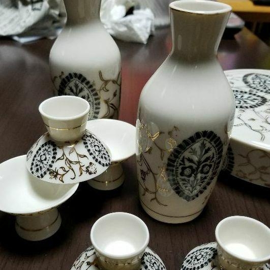 > 徳利二個とおちょこ五個、おつまみ入れのセットです。新品未使用ですが箱に痛みがあるのでお品のみの発送にさせていただきます。