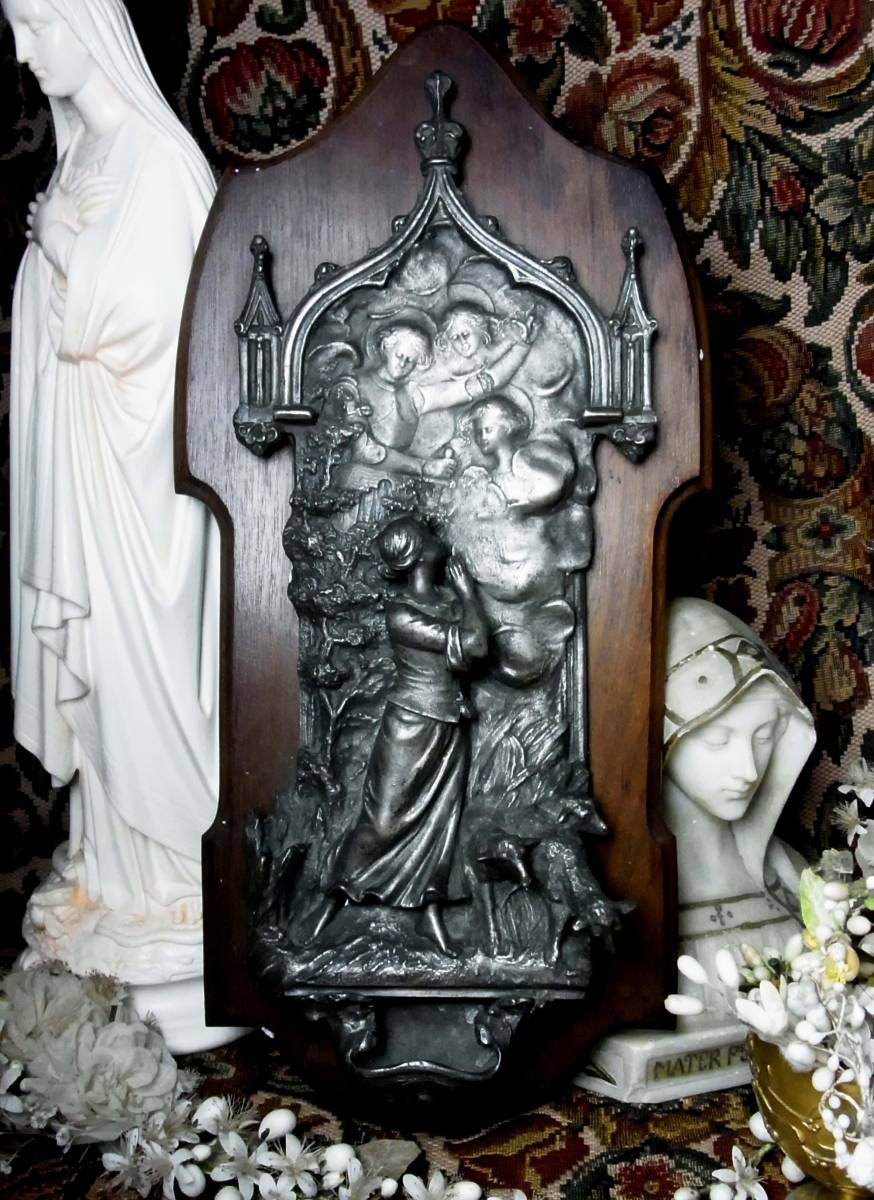 > 稀少 彫刻家 Xavier Raphanel 作 刻印入 大型の聖水盤 ジャンヌダルク フランスアンティーク 羊飼いの乙女 迫力の特大サイズ 宗教美術