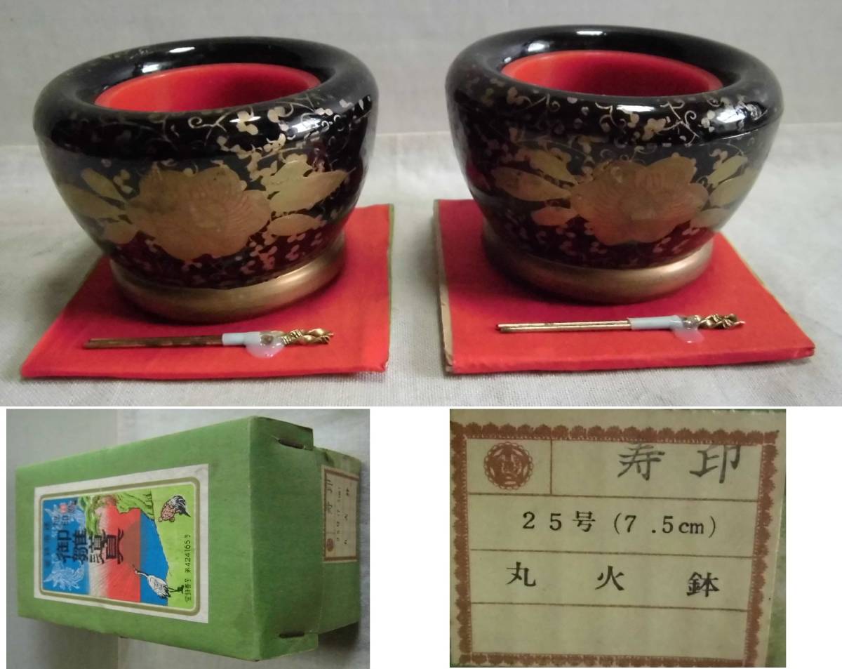 - 古い 雛道具 寿印 25号 丸火鉢セット 箱入り 火箸付き ひな祭り 雛人形 金蒔絵 唐草 置物 飾り物 工芸品 レトロ