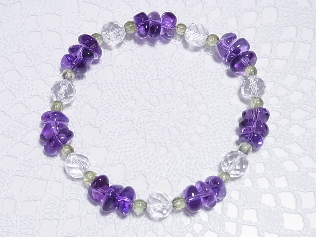 - 【限界市場】★送料無料★天然アメシスト ペリドット 水晶(カット)★伸縮ブレスレット