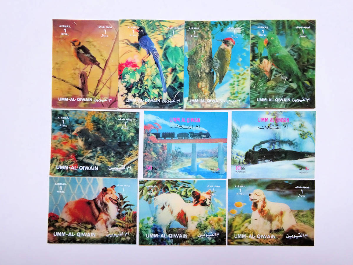 - ★送料込★ウンム・アル=カイワイン首長国 3Dホログラム切手★小鳥 機関車 犬★10枚★未使用のみ★同梱可★