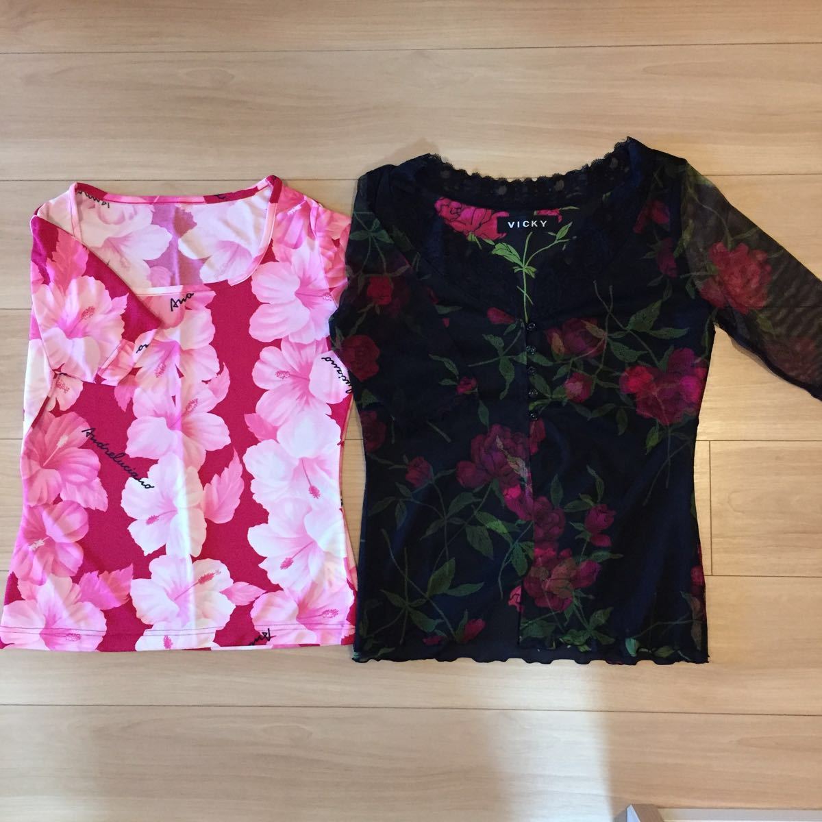 > トップス 半袖 カットソー ANDRELUCIANO ピンク ハイビスカス ストレッチ VICKY ヴィッキー バラ レース シースルー 黒色 花柄2点 未使用