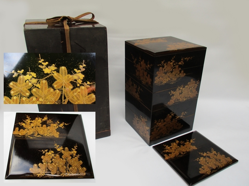 - 時代■旧家蔵出し 金高蒔絵[松竹梅] 重箱 五段 金縁内朱■天然木 骨董重箱 漆塗り 共箱 №5655■