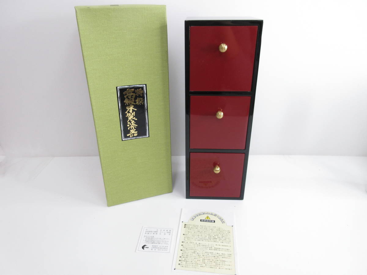 - 極美品◆高級木製漆器 三ツ引タンス 三段和風タンス 卓上タンス 小物入れ 赤 漆器 天然木 箱有 管理2003 P-9