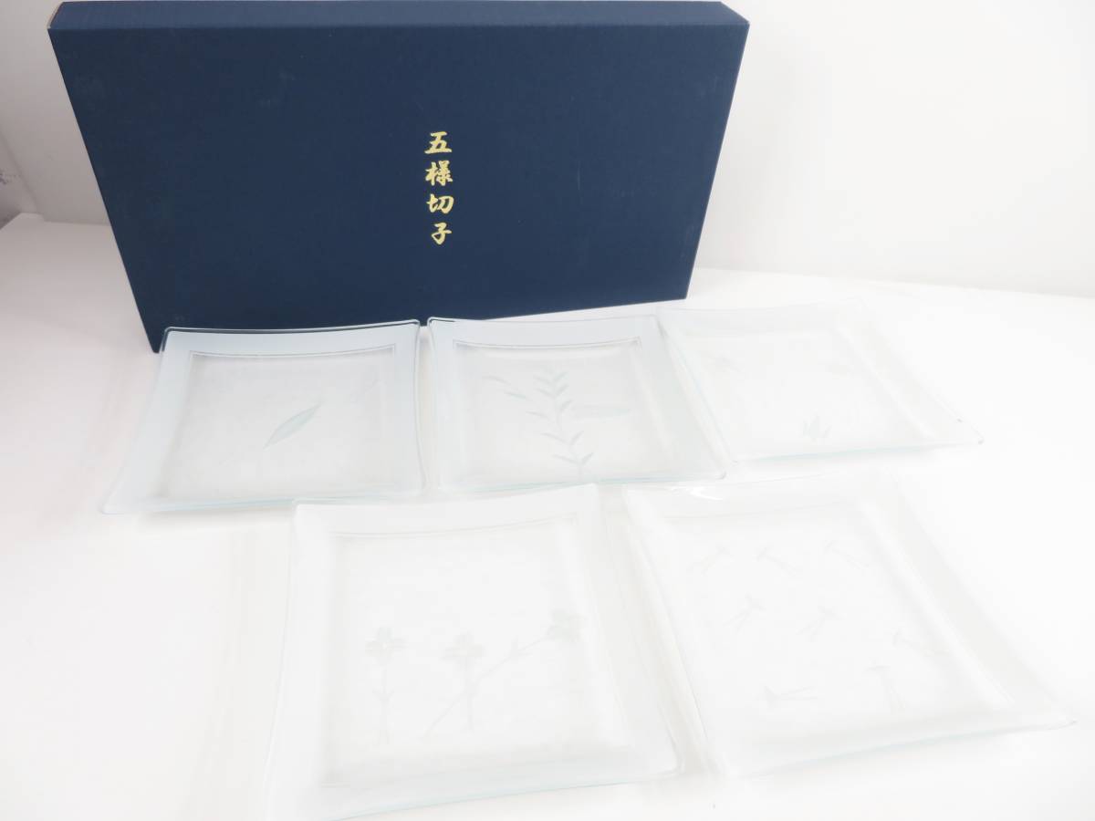 - 未使用品▲日本製 五様切子プレートセット 角皿 5客セット 箱あり 管理2004 R-9