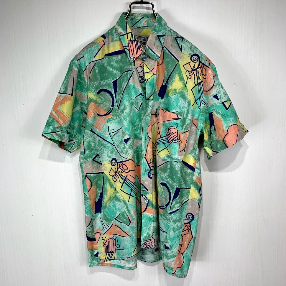 - ユーロ 半袖 ボタンダウン シャツ グリーン オレンジ 緑 模様 総柄 メンズ 古着