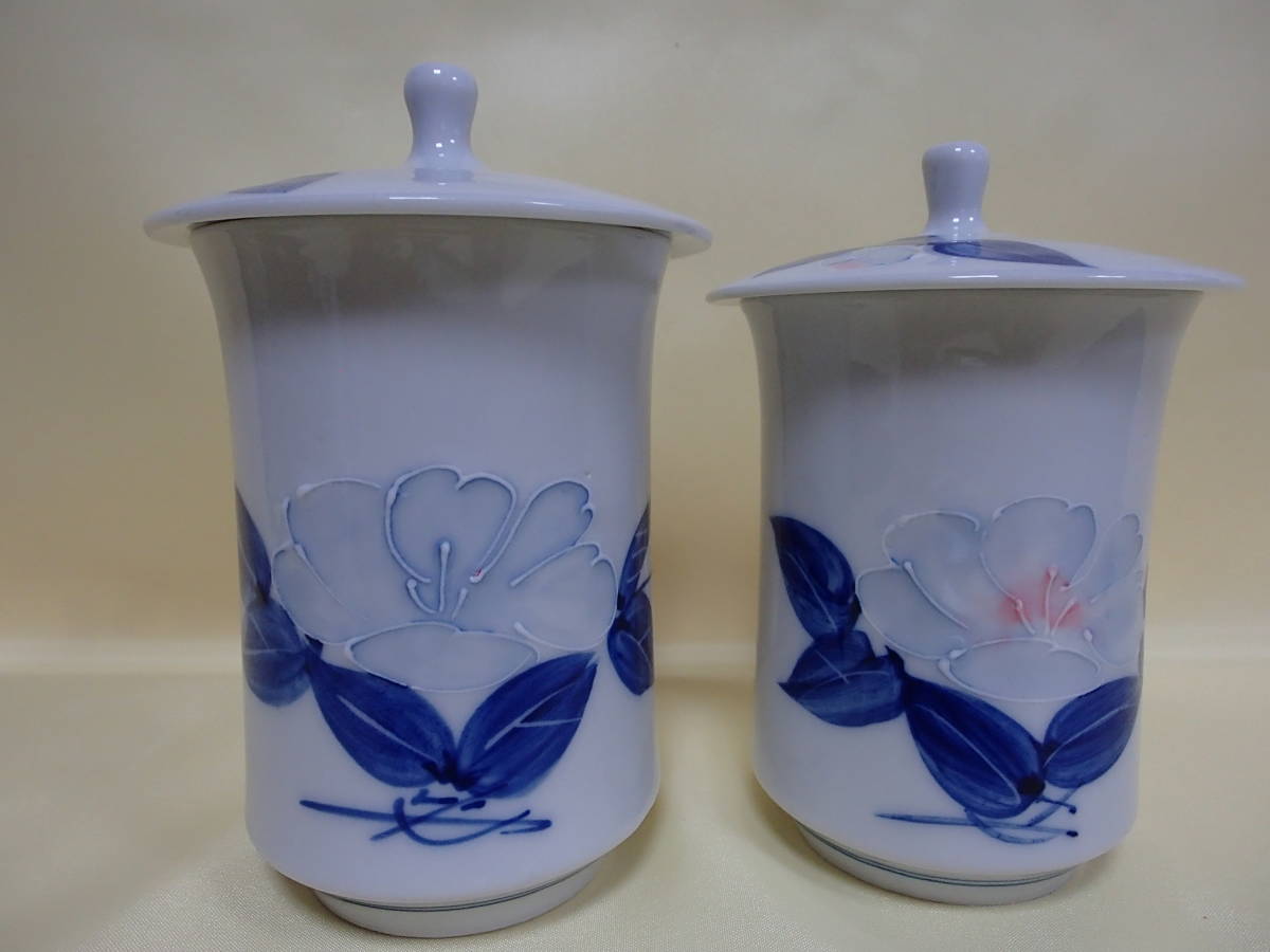 - 【蓋付き湯のみ】(ペアー)【磁器】【椿】【一鳳作】未使用・箱なし・美品