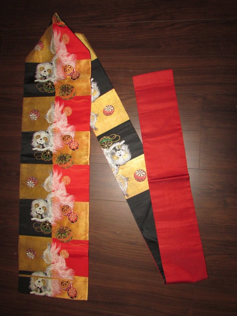 - 1000円値引き即決(旧家・蔵出し)(古布・大嶋織・毬に狆模様織り出し名古屋帯)NO2・珍模様・貴重・珍品