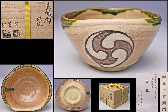 > 加藤十右衛門 窯 (大萱八坂窯 山十窯 )★ 赤織部巴紋茶碗 ★ 共箱栞 ★ 加藤光右衛門 加藤芳右衛門 加藤弥右衛門 襲名記念