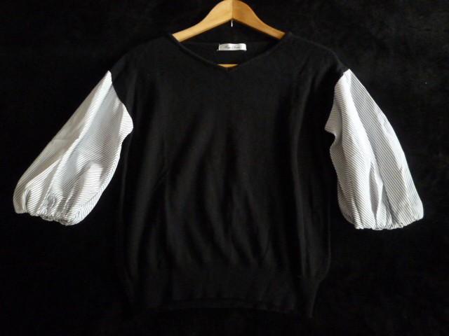- Rose Farm/ローズファーム○黒異素材ストライプドッキングニットセーターM/ボリューム袖バルーン袖ブラウン重ね着風長袖トップス○⑤ST1022