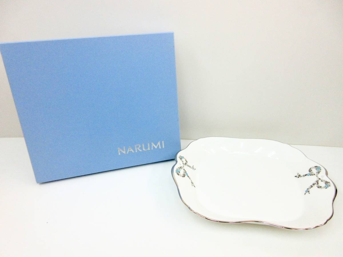 - 未使用品 ▲NARUMI Bone China ナルミボーンチャイナ リーフサービスプレート 1枚 リボン 可愛い 銀縁 箱あり 管理2011 Z-10
