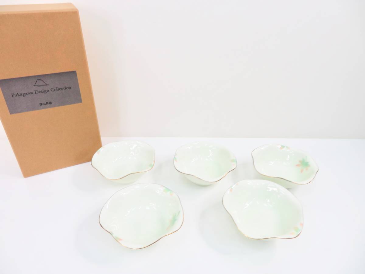> ◆有田焼 深川製磁 深川デザイン 宮内庁御用達 グリーン楓 深小皿揃 小鉢 5客セット 紅葉 食器 キッチン食器 未使用品 管理2011 Q-8
