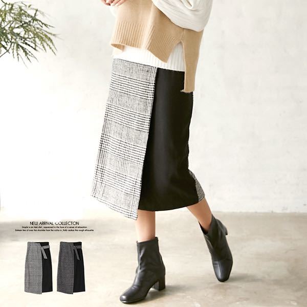 - HONEYCREEPER グレンチェックバイカラーハイウエストナロースカート オフ×ブラック