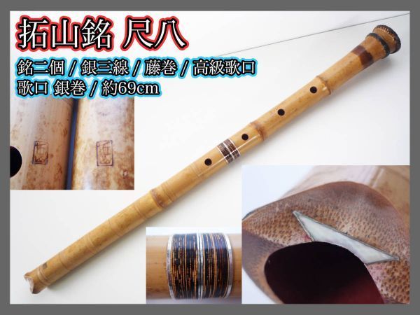 > 旧家蔵出 高級尺八 拓山 銘二個 尺八 高級歌口 銀三線 藤巻 歌口銀 刻印 在銘 約69cm 中継 竹製 艶感 伝統狂言雅楽能古美術骨董 M2(検:真山