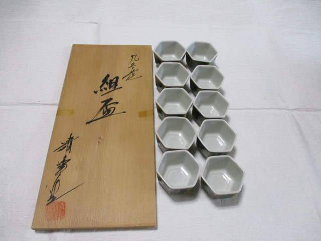 - 九谷 組盃 10客 未使用 共箱 六角形 角福
