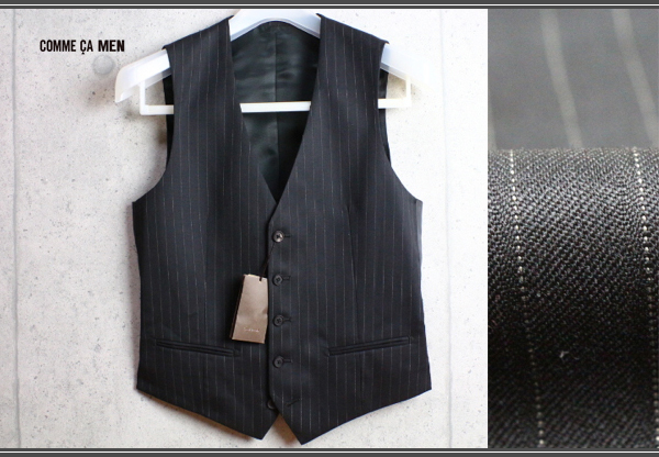 - 新品コムサメン高級ウール生地ピンストライプジレ44S黒ベスト2