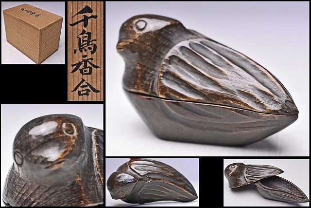 - 木彫 千鳥 香合 ★ 木箱 ★ 香道具 茶道具 ★ 味わいが良くやや時代を感じさせる逸品 ★