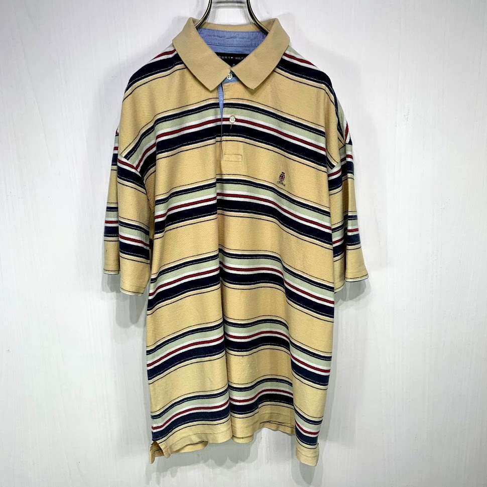 > TOMMY HILFIGER ボーダー ポロシャツ XLサイズ クリーム トミー ヒルフィガー 旧ロゴ ライオン 古着 メンズ 大きい ビッグ オーバー サイズ