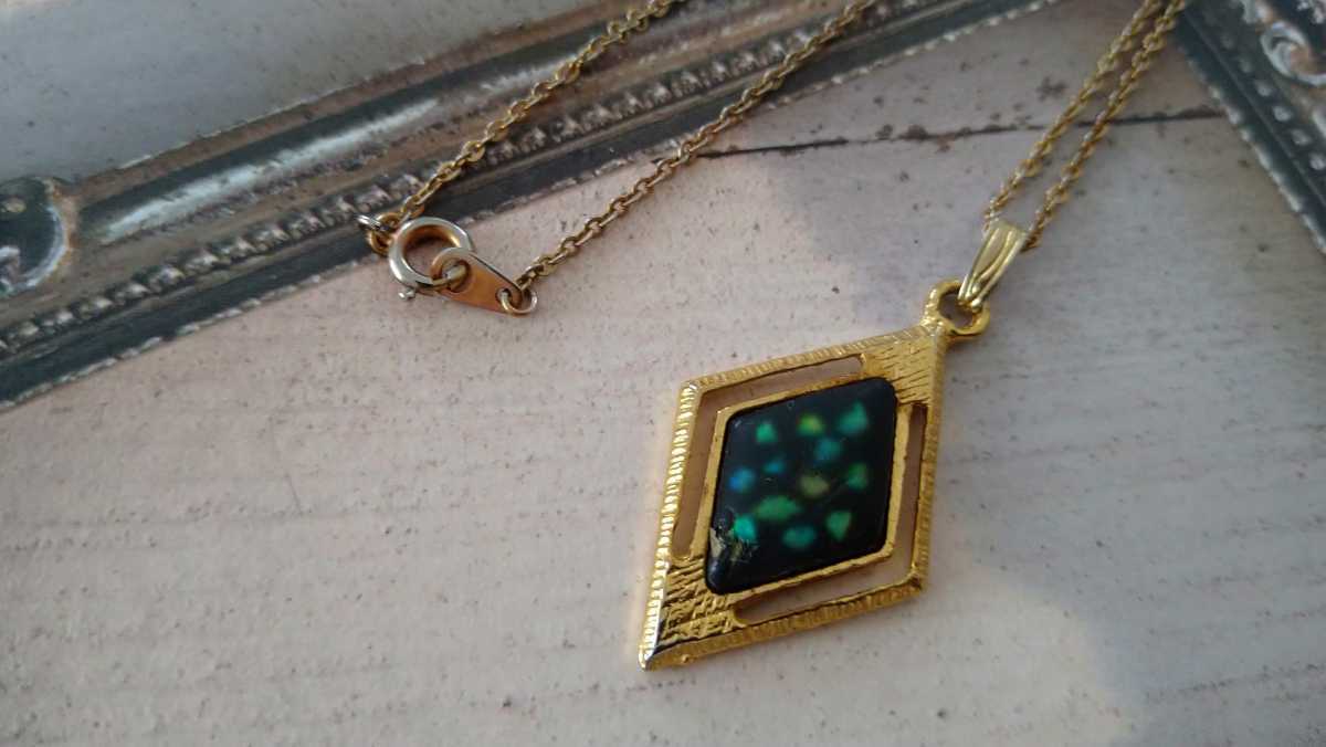 - □訳あり□菱形モチーフ・ゴールドカラーチェーンネックレス□緑×黒・模様入りチャーム□