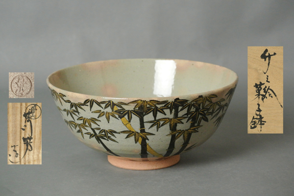 - ∞ 南 美 ∞【 小峠丹山 (葛芳) 竹之絵 菓子鉢 共箱・共布付き】 最大径約22.5cm 金彩 師: 人間国宝 島岡達三 叔父: 真葛香斎 茶道具