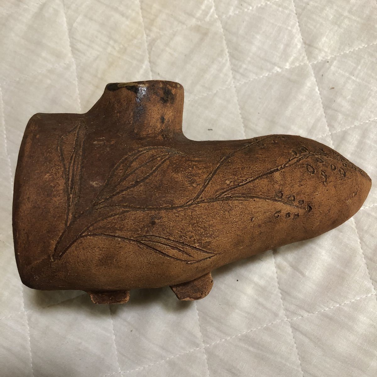 - アンティーク.備前焼.信楽焼.素焼き.一輪挿し作家物.底に落款.釜印有ります.水漏れ無いです.横幅.約19センチ.高さ.約11センチ.奥行き.約9.7