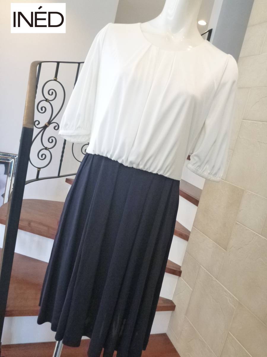 - 3万 新品同様 INED イネド ★白×濃紺 ワンピース 9 M相当