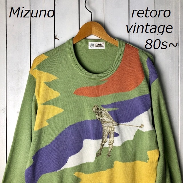 > レトロ古着 80s~90s Mizuno ミズノ ゴルフ刺繍コットンニットセーター L モスグリーン オールド ヴィンテージ アクリル ゴルフウェア ●95