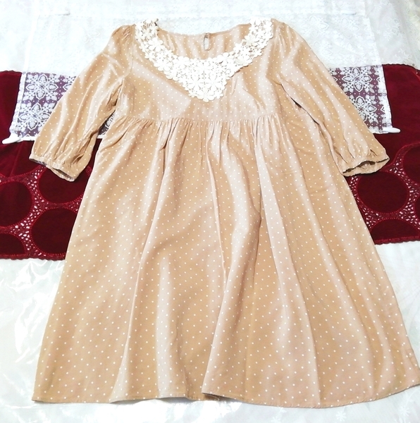 > ライトブラウン白水玉長袖チュニック ネグリジェ ナイトウェア ワンピース Light brown white polka dot tunic negligee nightwear dress