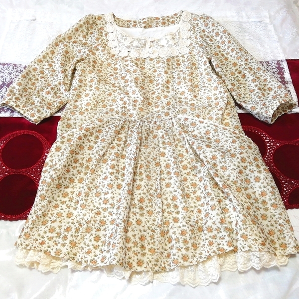 > ひまわり柄綿コットン白レース長袖チュニック ネグリジェ ワンピース Sunflower pattern cotton white lace tunic negligee dress