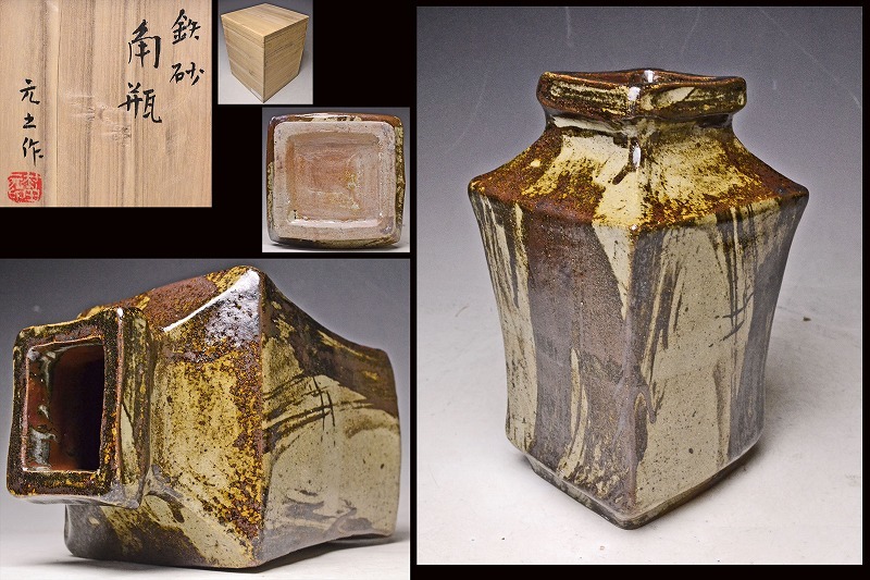 > 村田元 ★ 鉄絵扁壷 ★ 共箱 ★ 華道具 ★ 茶道具 ★ 民芸陶 ★ 検 人間国宝 浜田庄司 村田浩 木村一郎 益子焼 ★ 角瓶